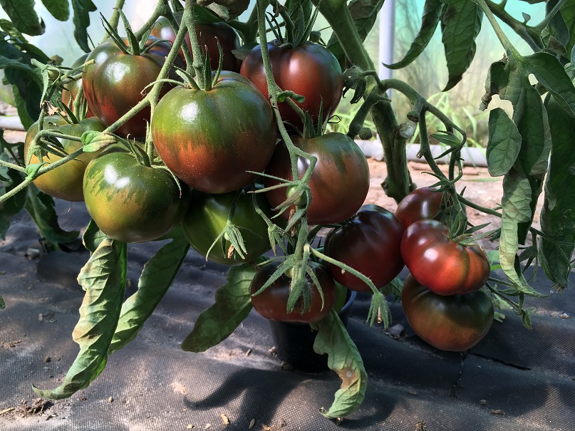 Eine sehr ertragreiche und frühreife Tomate mit einer rotbraun-lila Färbung und grünem Kragen. Typisch für dunkle Sorten: Je mehr Sonne an die Früchte kommt, desto dunkler und violetter färben sie ein. So sind die Früchte der unteren Trauben meist etwas blasser als die Oberen, die mehr direktes Licht genießen. Geschmackliche Auswirkungen konnten wir dabei bisher nicht feststellen. Die runden Früchte [100-150g] sind fleischig und saftig zugleich und liefern ein fruchtiges Tomatenaroma. Kultiviert man PURPLE PRINCE mit zwei Stämmen erntet man hinsichtlich der Fruchtgröße relativ homogene Früchte [100-120g] und bekommt nur selten sehr große Früchte bis 300g.