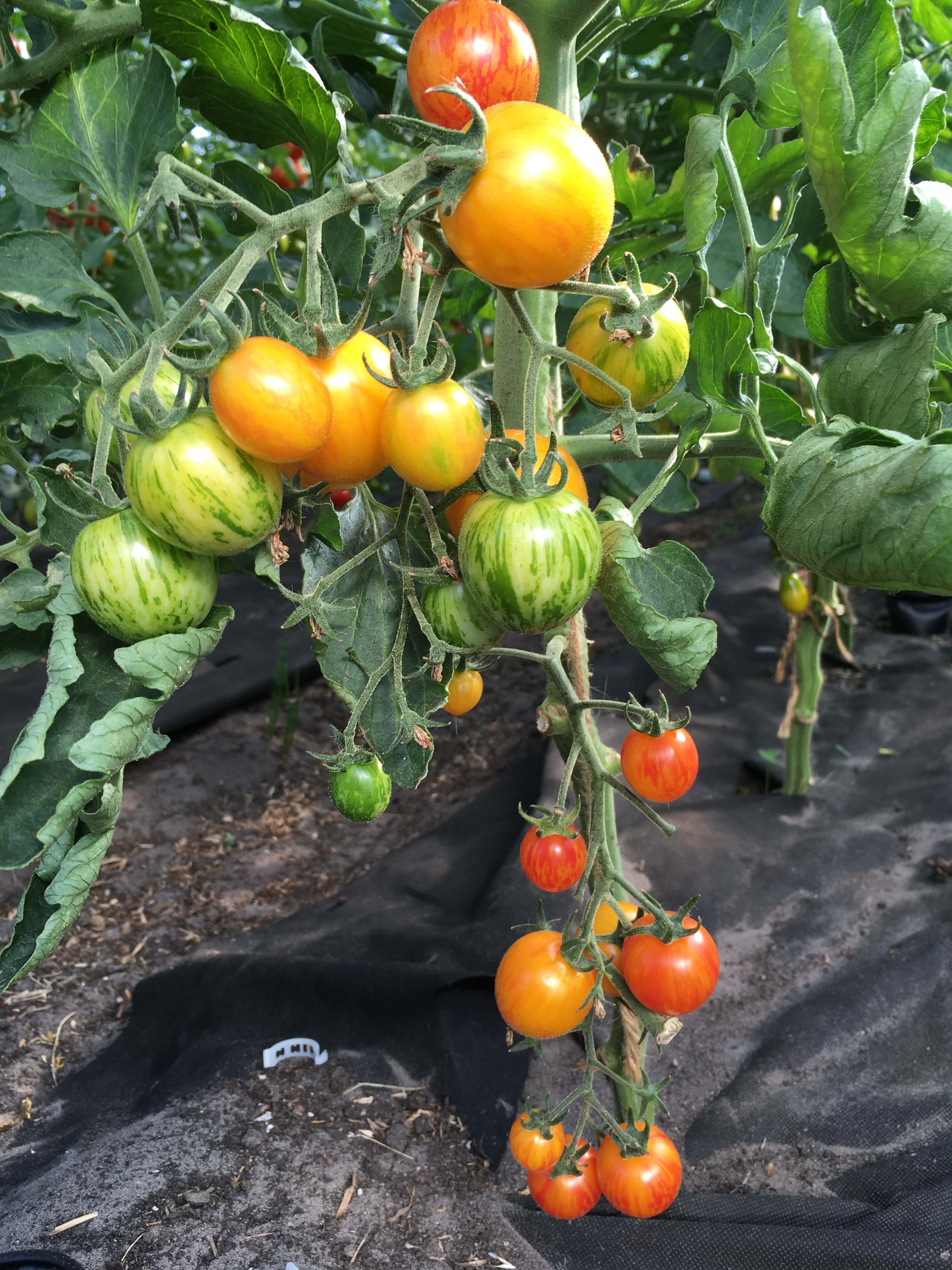 Viele hübsche Früchte [30-40g], sonnengelb-orange und rot getuscht. Geschmack: süß-fruchtig, Fleisch leicht mehlig, dennoch irgendwie saftig. Bumble Bee-typisch sind wüchsige, starke produktive Pflanzen, welche gezielt ausgelichtet werden sollten, sonst verbuschen sie zu sehr (und beeinträchtigen die Luftzirkulation im Gewächshaus).