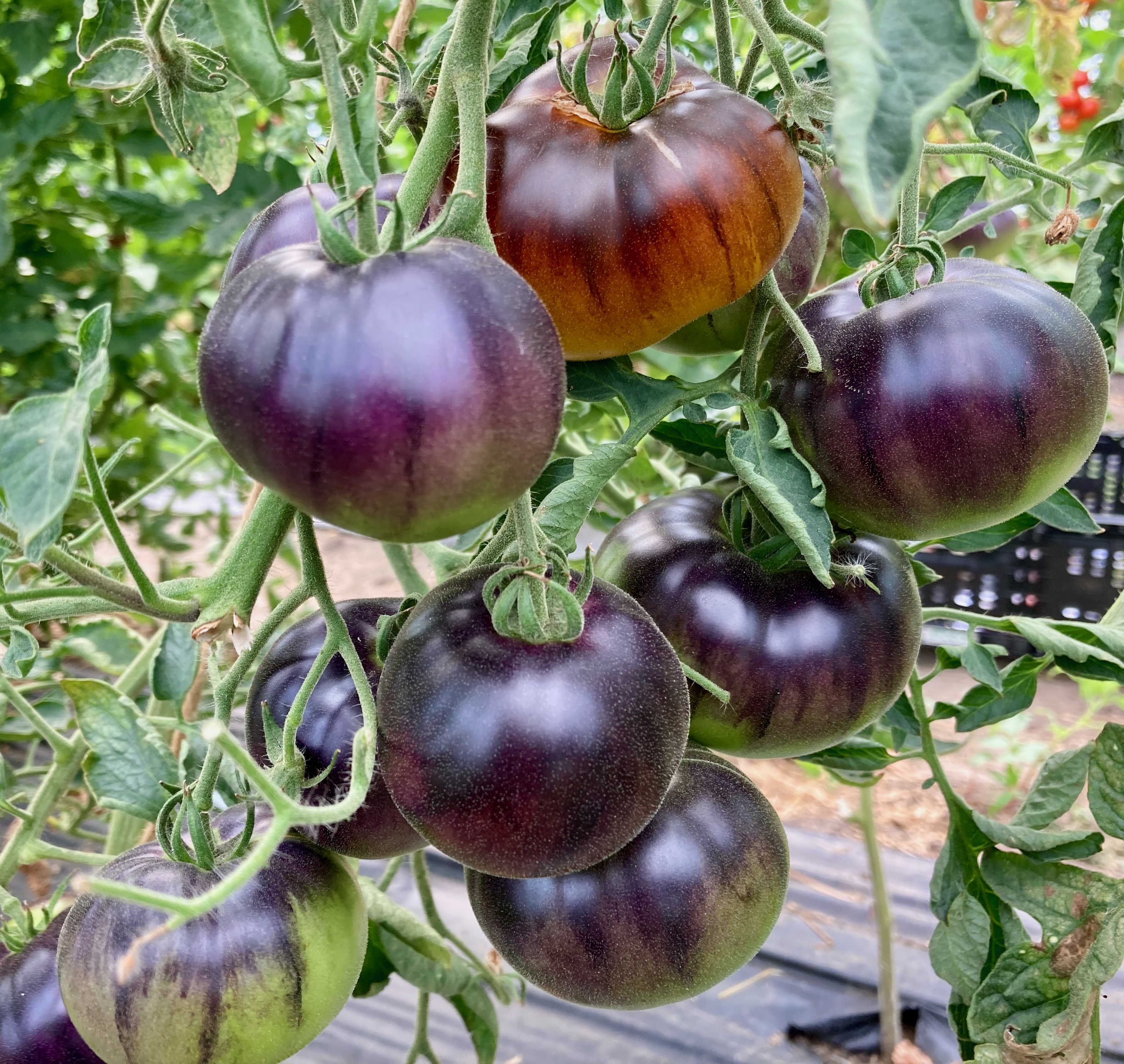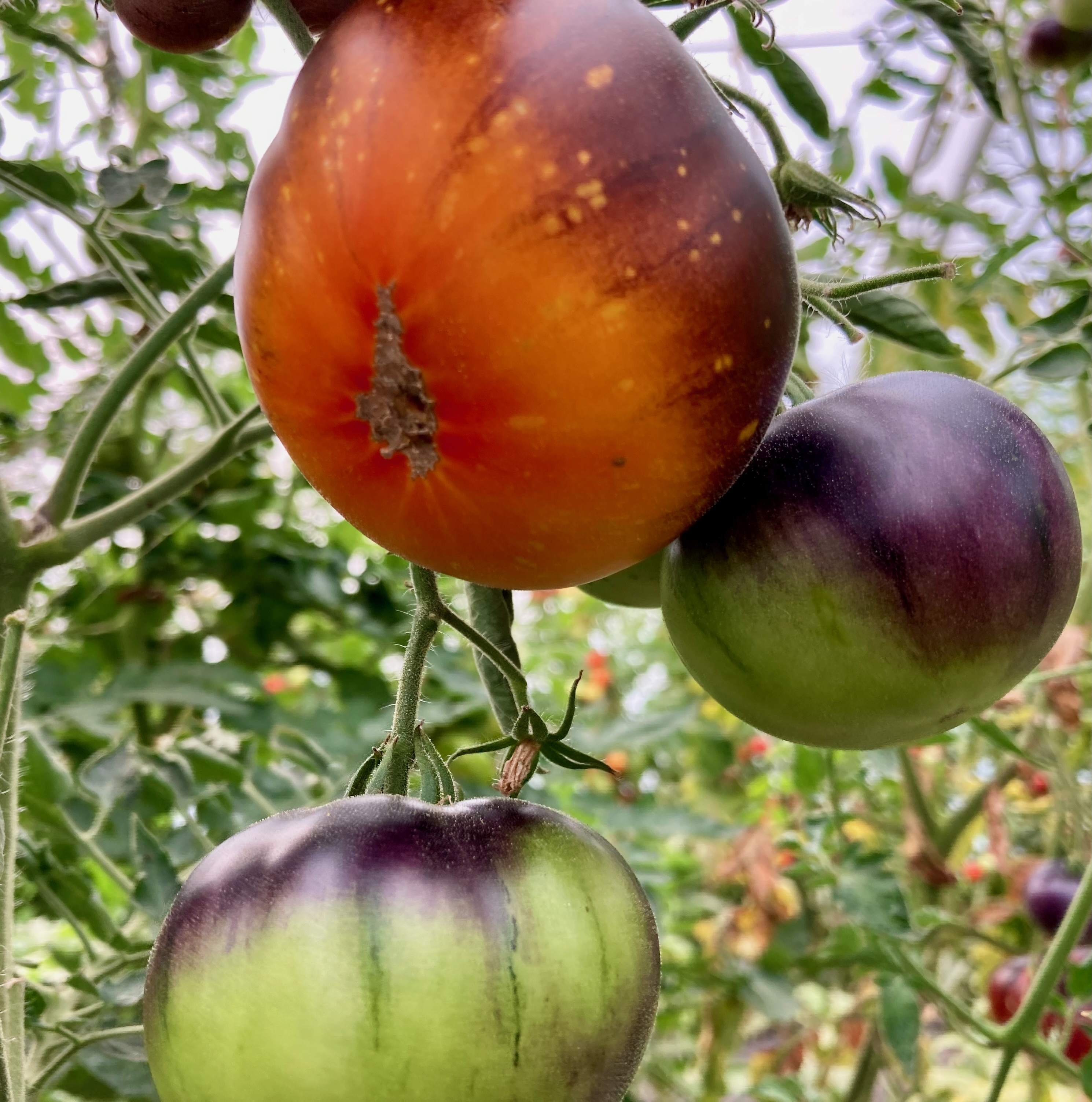 Eine wunderschöne, mehrfarbige mittelgroße Fleischtomate (80-100g) mit recht homogenen Früchten und gutem bis sehr gutem Ertrag. Ein Farbenspiel aus Antocyan, Gelb Orange und Rot. Pflanzenwuchs bis 180cm.
