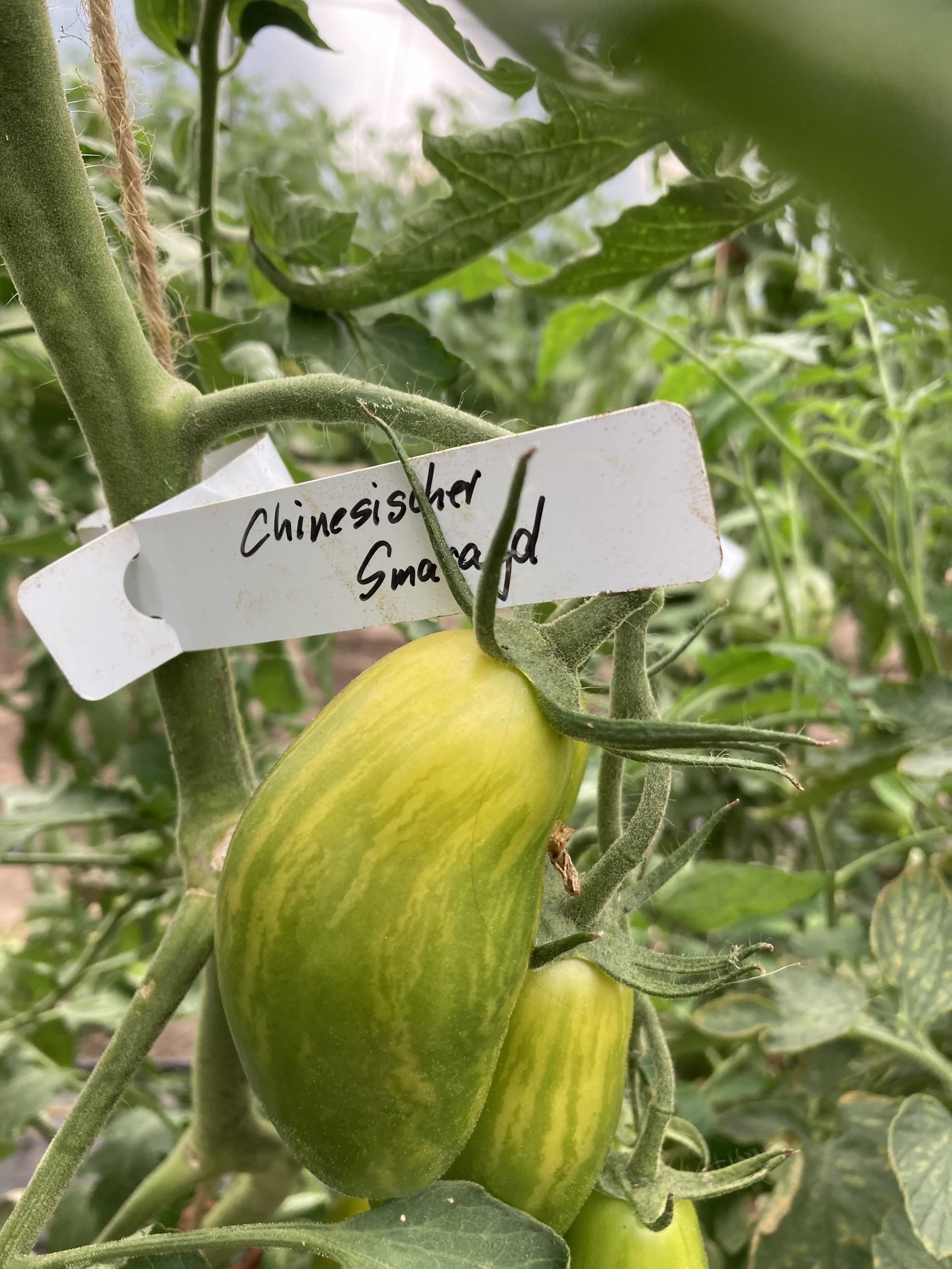 Äußerst seltene grüngetigerte chinesische Sorte. Leicht bauchige Flaschentomate mit schöner Spitze und sehr gutem Geschmack. Reift grüntypisch ins Ockagelb mit wunderbar würzigem Aroma, saftig und ertragreich.