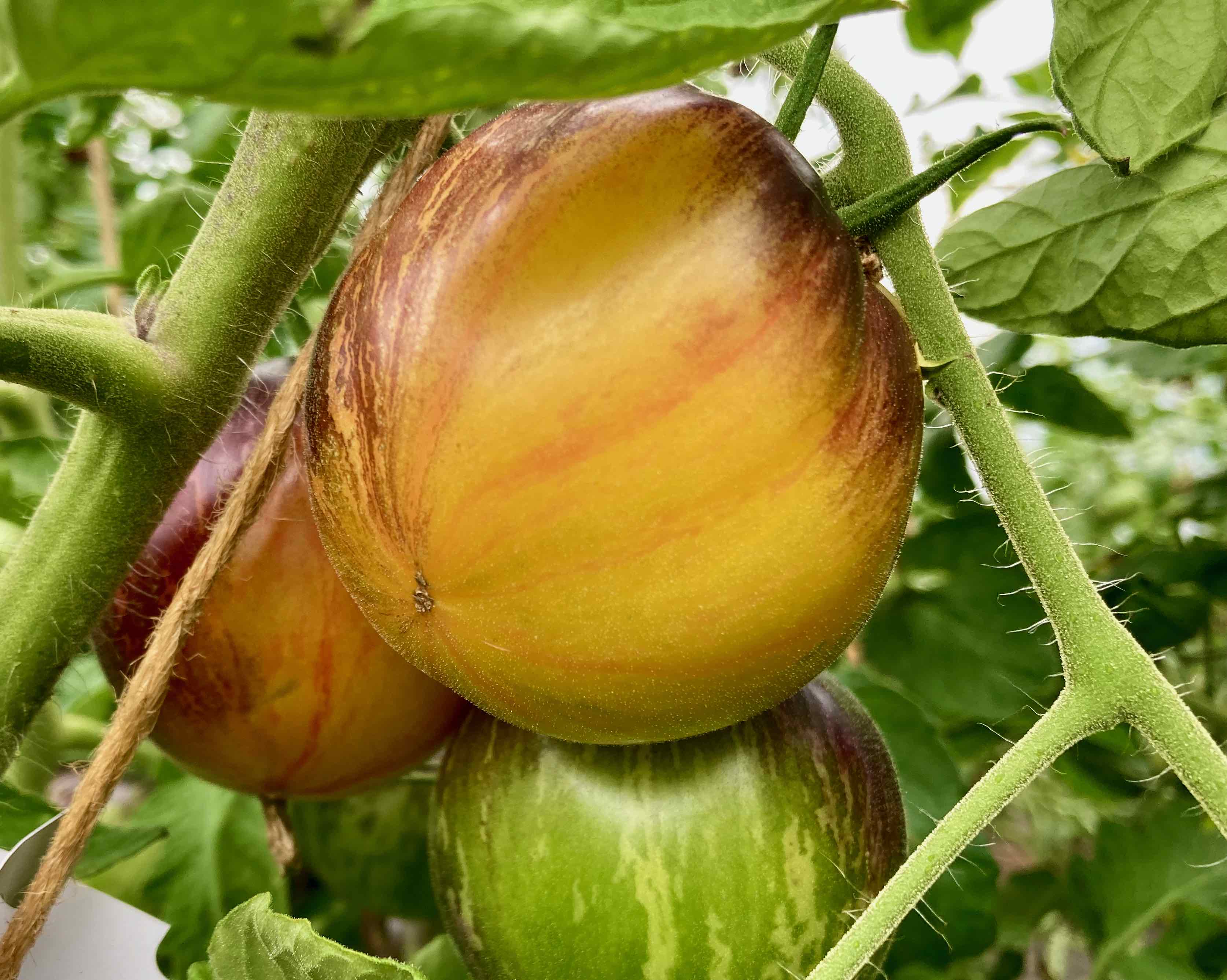 Eine wunderschöne, mehrfarbige mittlere Fleischtomate mit ausserordentlichem Ertrag: Dieser setzt früh ein und hält sich dann auf hohem Niveau bis weit in den Spätsommer.Der Geschmack überzeugt fruchtig, süß mit einem Schuss Säure. Normaler Pflanzenwuchs bis 180cm.