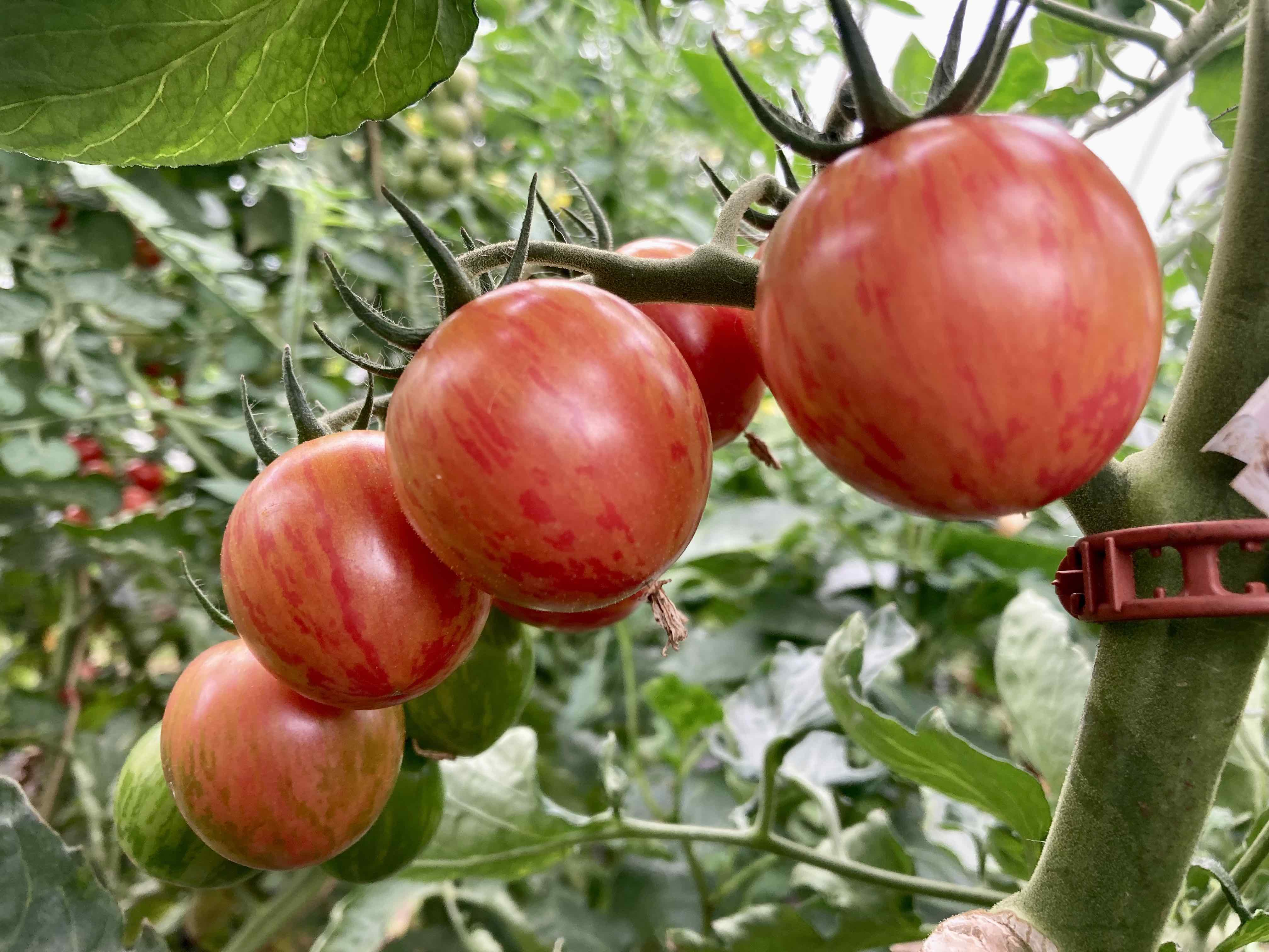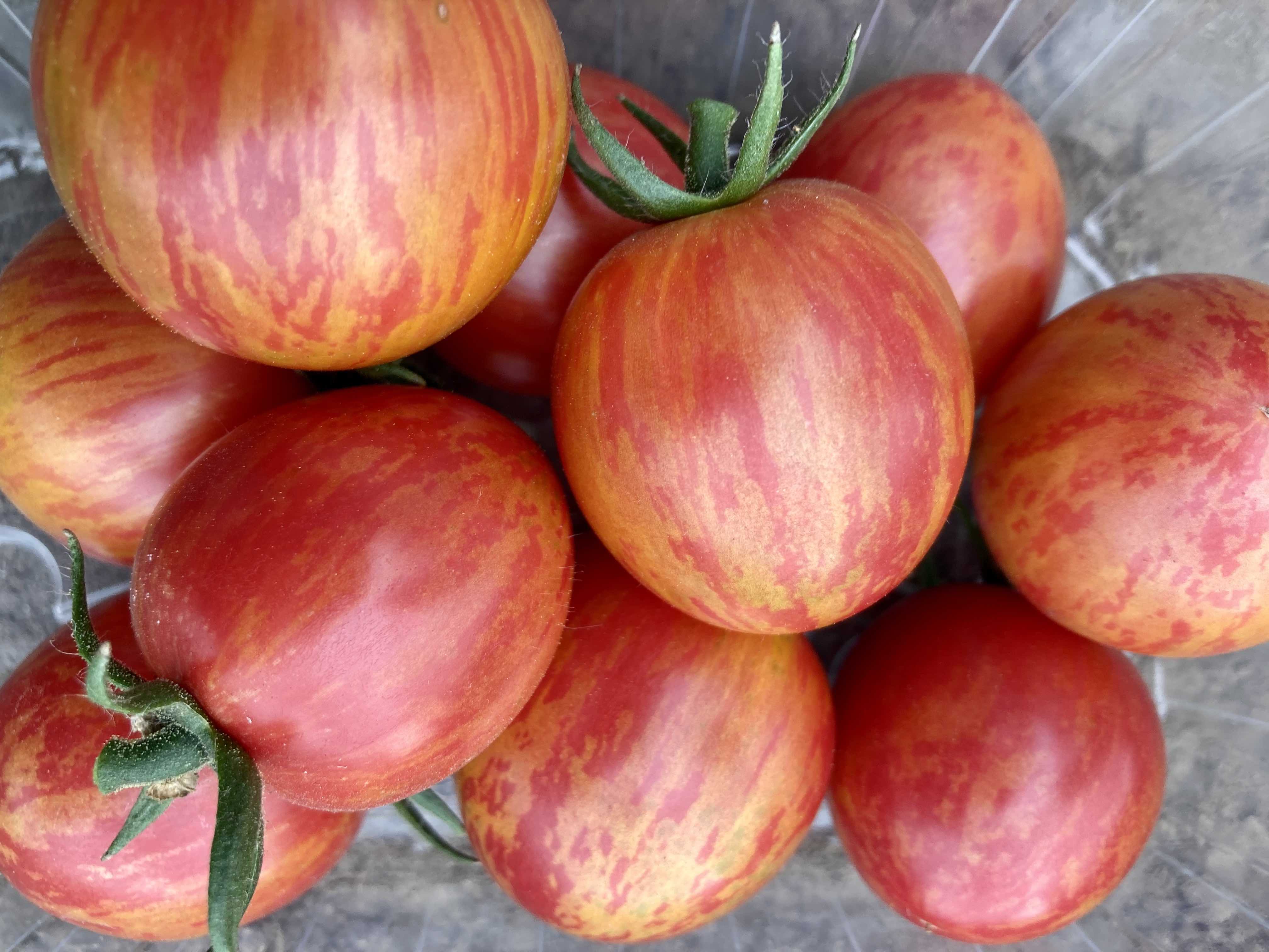 Die wirklich hübsche und aromatische rosa Variante aus dem Bumbleversum. Ausdauernd bei mittlerem Ertrag und großer Flug.. ähh Wuchsfreude erfreut sich diese Hummel bester Gesundheit. Weniger starkes und dichtes Laub als bei anderen Varianten. Für eine Bumble Bee recht offen im Wuchs. Früchte um die 30-40g mit typisch fester und ewig platzfester Schale, die lange hängen können und werden.