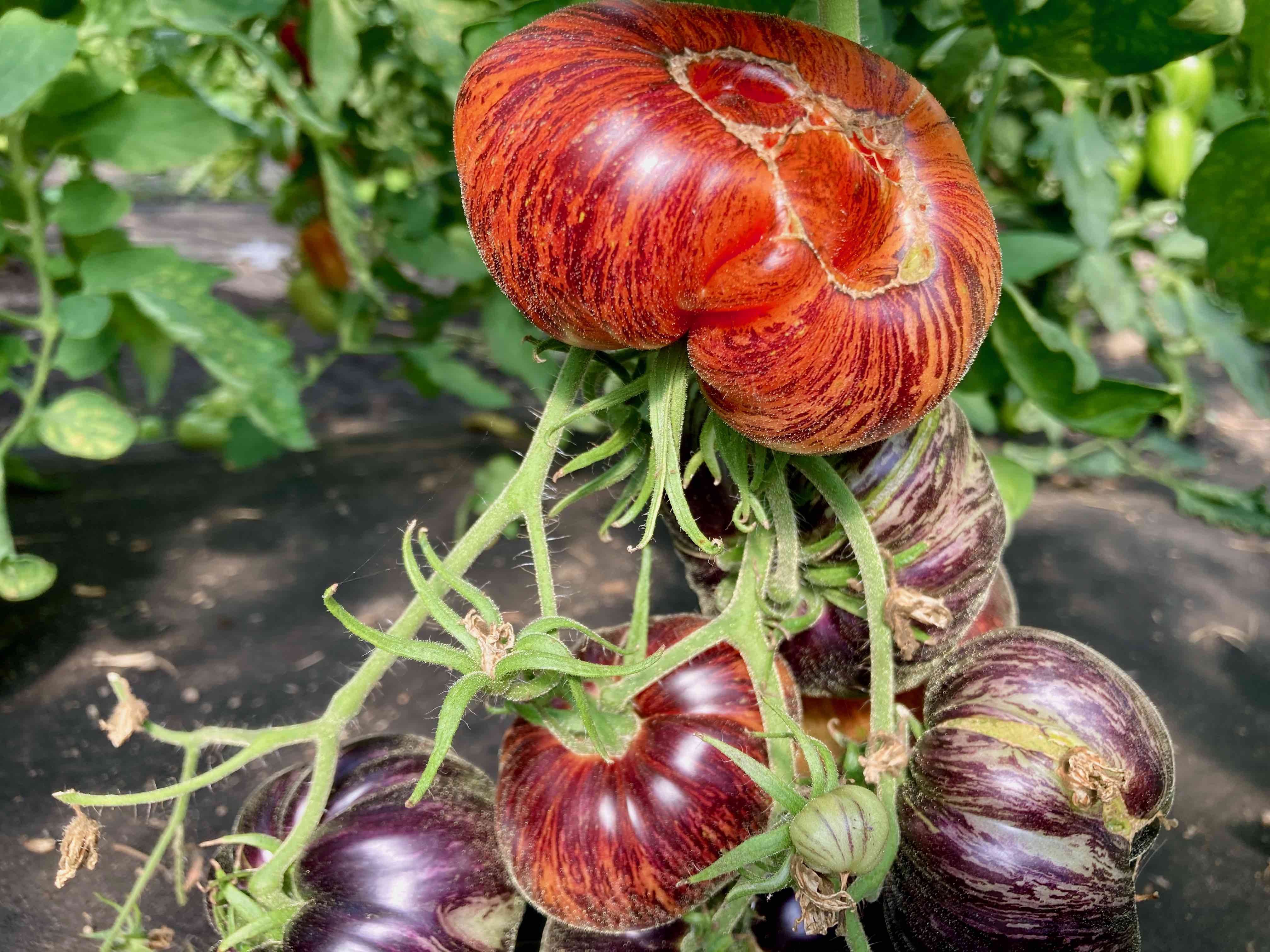 E steht für Elemens, eine Zuchtreihe vom Kleverhof. EIne fantastische Fleischtomate mit überzeugendem Aroma, süß mit ausgewogenem Säureschuss. Optisch eine Sensation. Schwarze (anthocyane) Schultern auf leuchtend rot-orangefarbenem Kleid. Die Sonnenseiten eher rot, die Schattenseiten eher orange. Es sieht aus als wären die blauen Streifen mit dem Pinsel aufgestrichen.